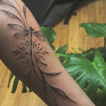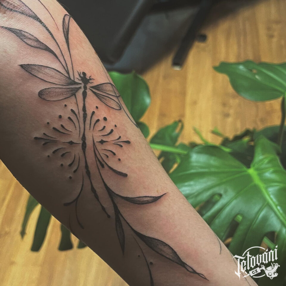 Tetování větvička, vážka a ornament na předloktí
