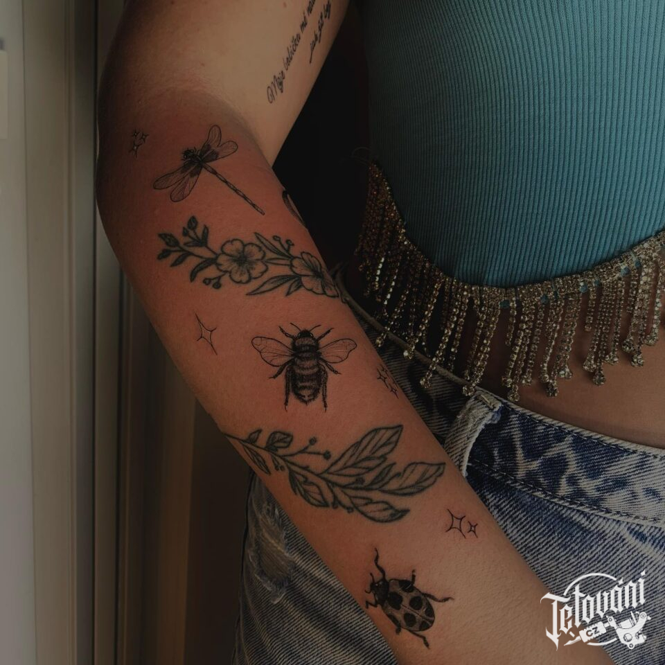 Tetování větvička, včela na předloktí