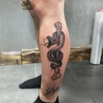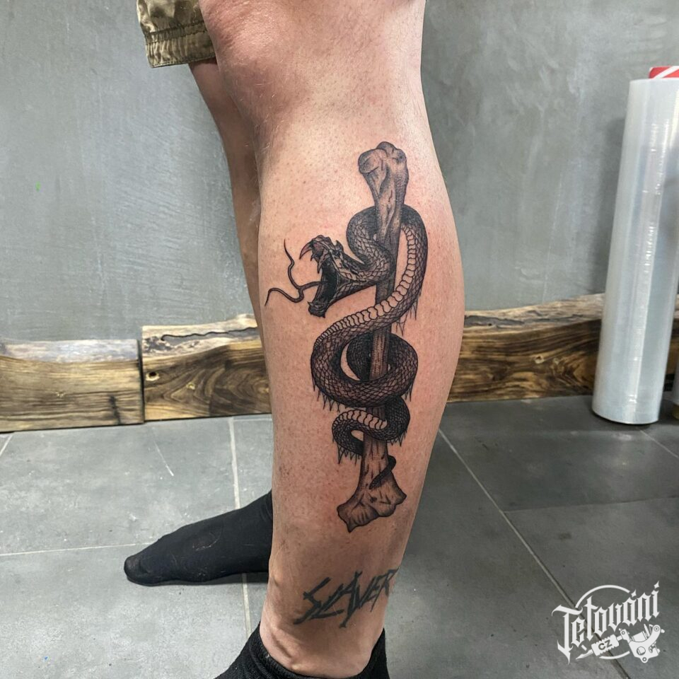 Tetování větvička, zvíře had na lýtko