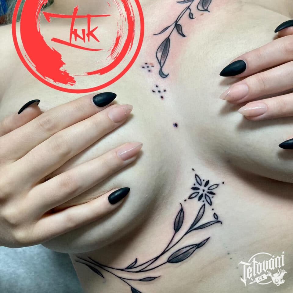 Tetování větvičky a ornamenty pod klíční kostí a na žebrech