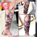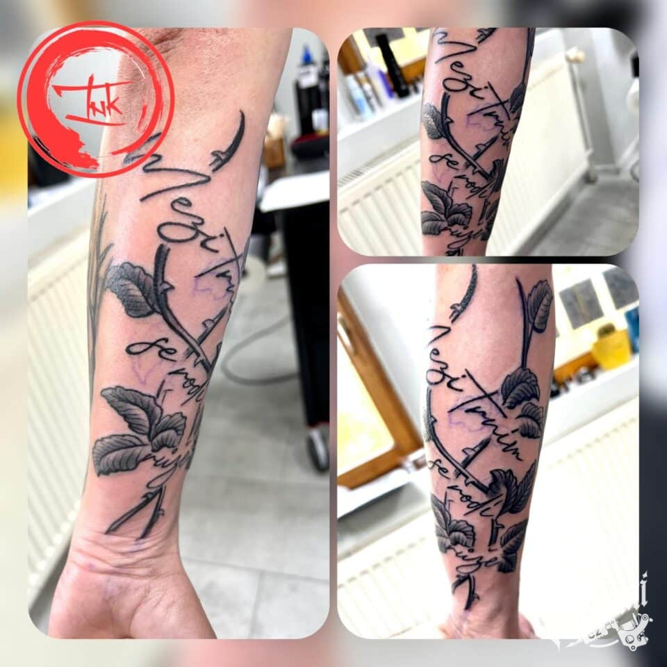 Tetování větvičky s nápisy na předloktí