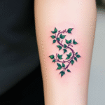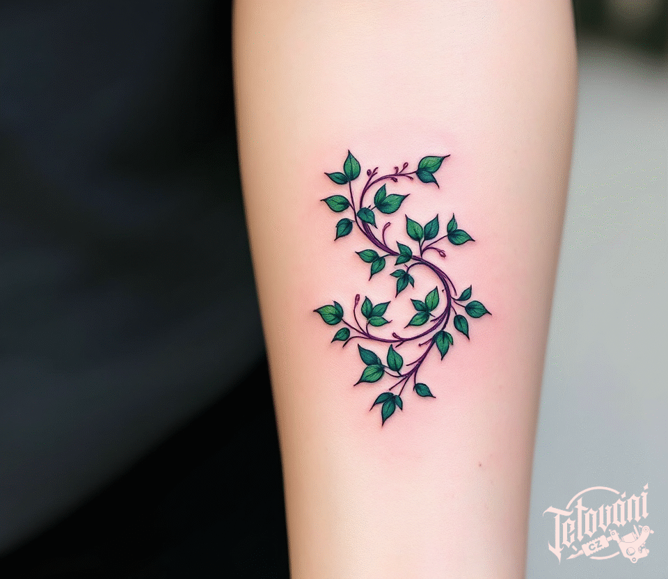 Tetování větvičky s písmenem S, nápis na předloktí