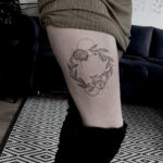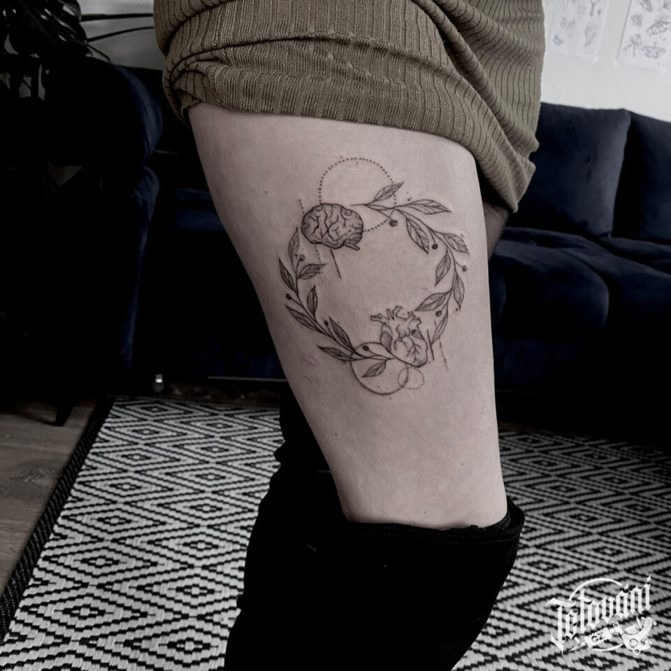 Tetování větvičky, věneček, srdce a mozek na boku stehna