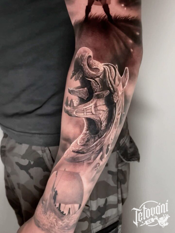 Tetování vikingové, loď na paži