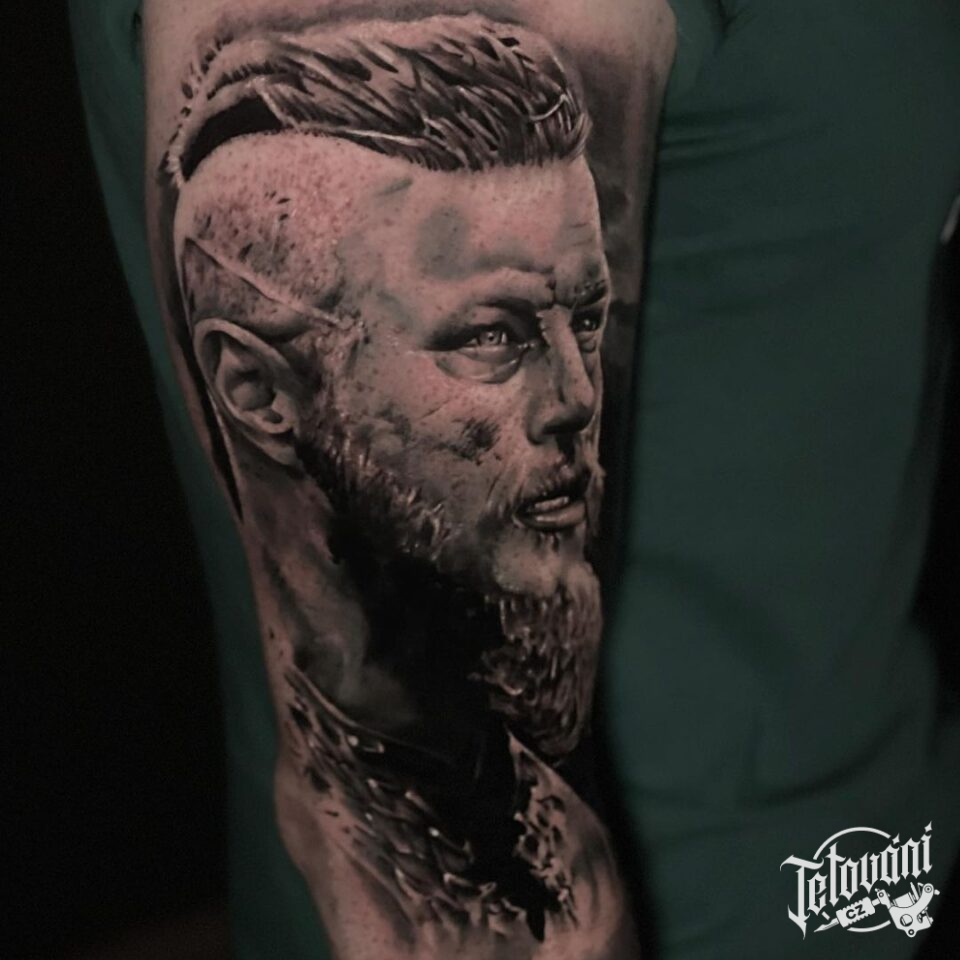 Tetování Vikingové, portrét Ragnara na rameni