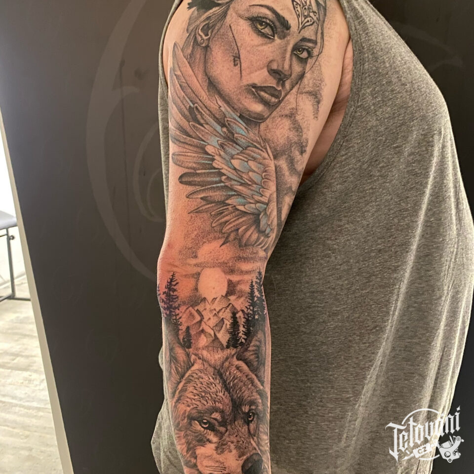 Tetování vikingská žena s hlavou vlka, příroda hory na ruku
