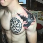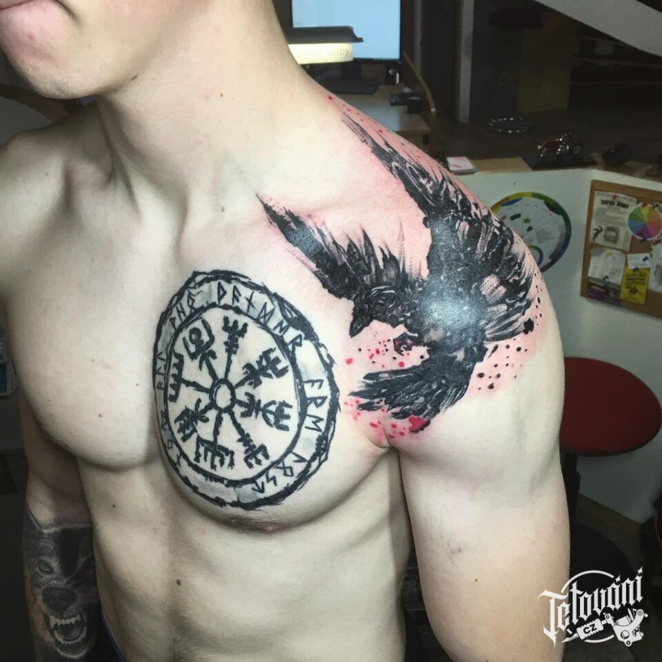 Tetování vikingský kompas a havran na rameni