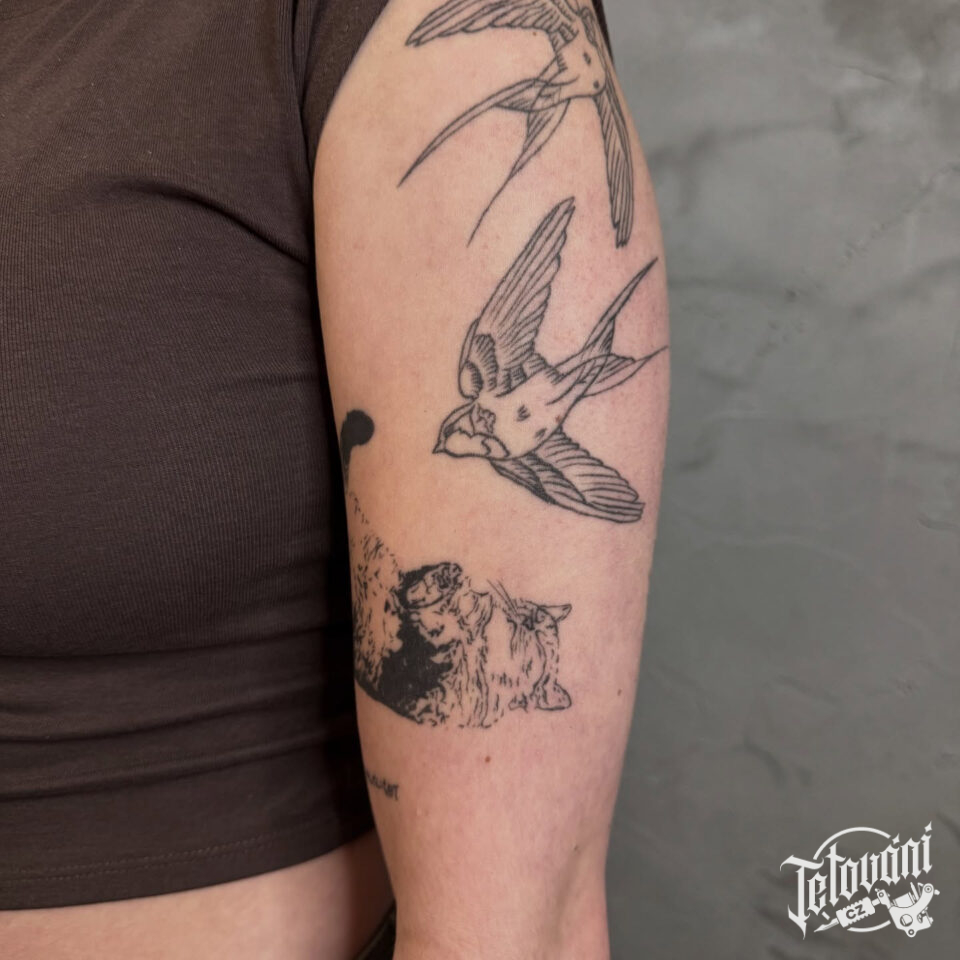 Tetování vlaštovky a zvíře kočka a vlaštovky