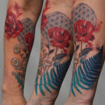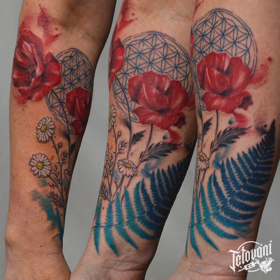 Tetování vlčí mák a luční kvítí na předloktí
