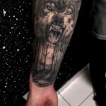 Tetování vlk, les a měsíc na předloktí