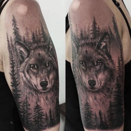 Tetování vlk v lese na předloktí