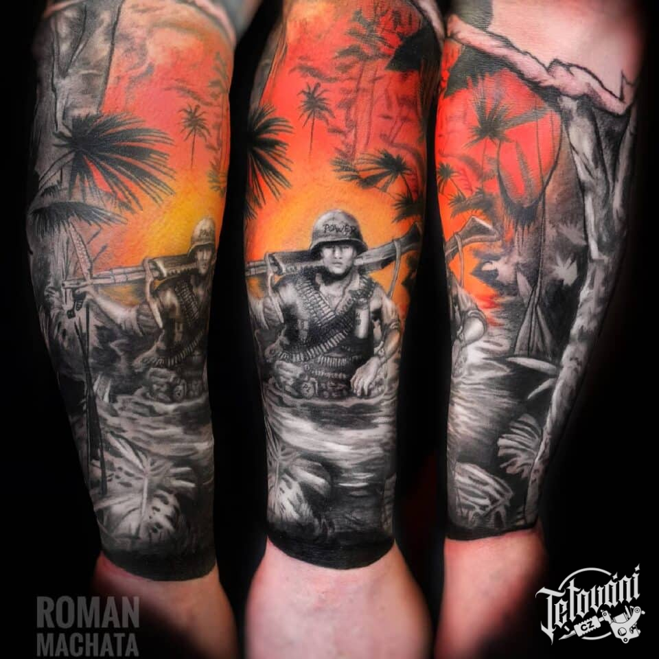 Tetování vojáci a příroda na na předloktí