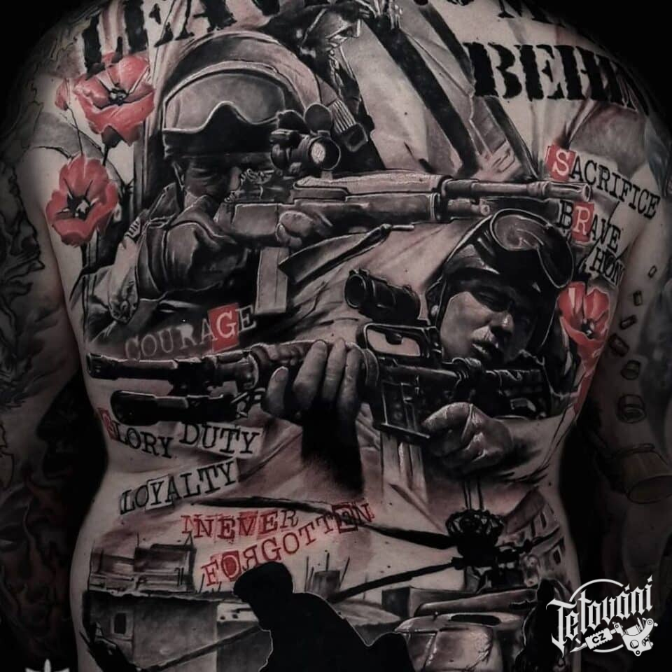 Tetování vojáci, odstřelovači na zádech