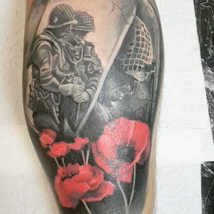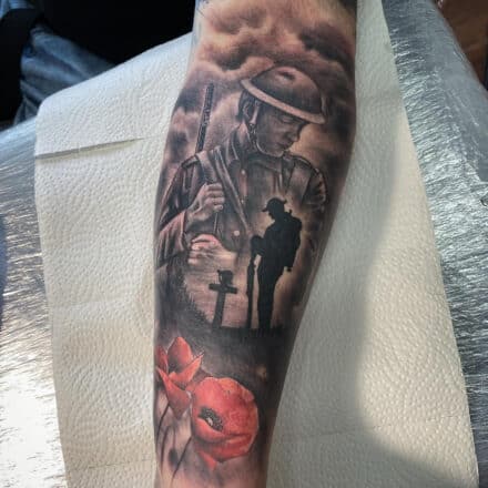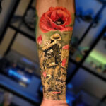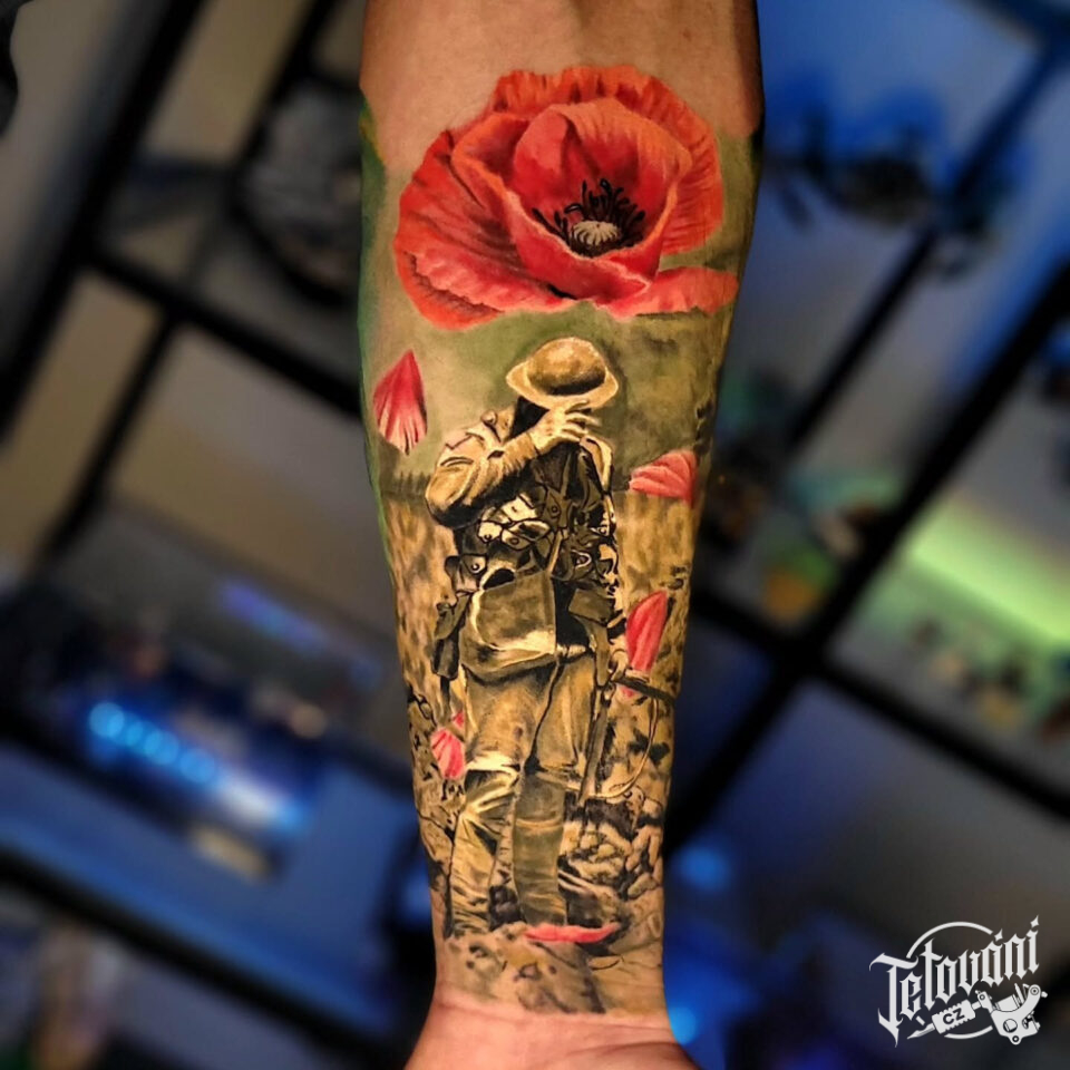 Tetování voják a vlčí mák na předloktí