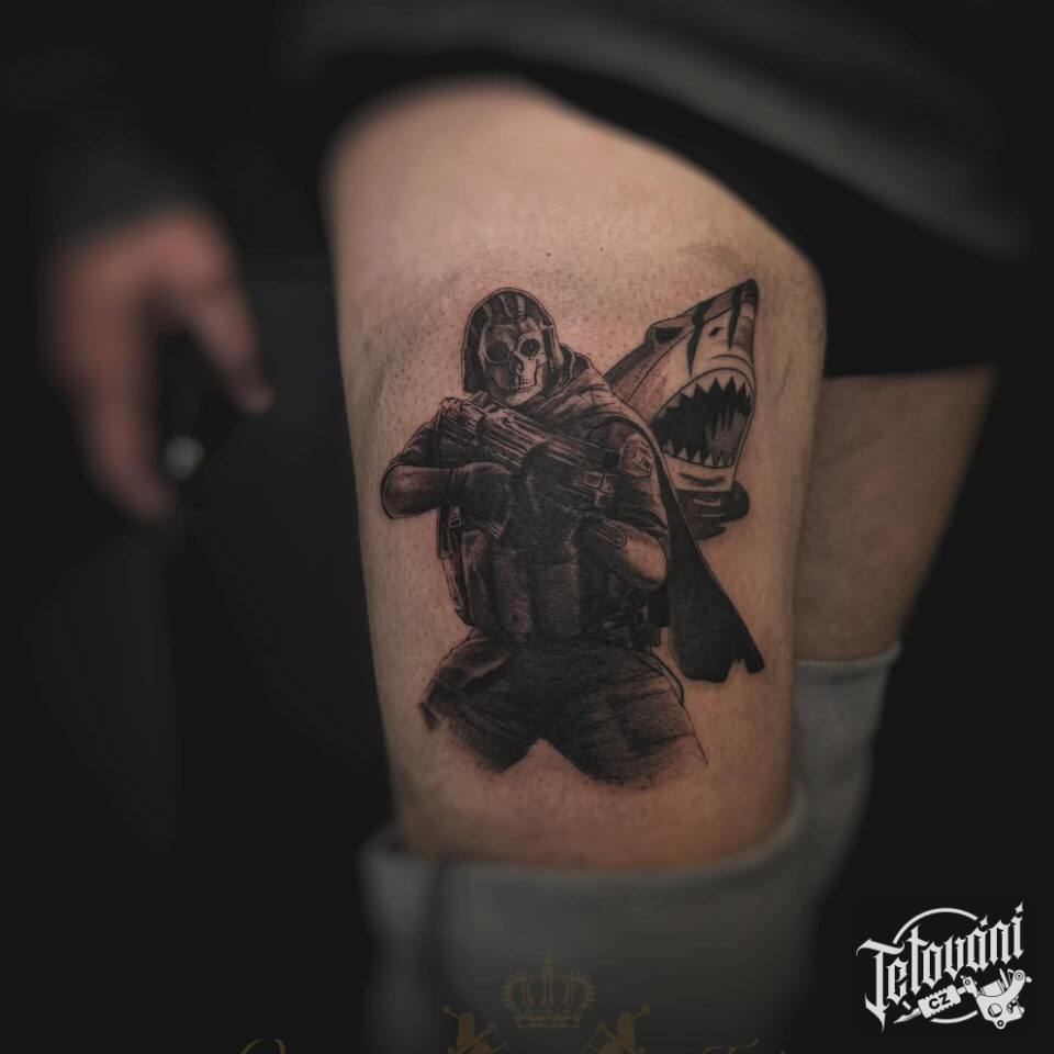 Tetování voják a žralok na stehně