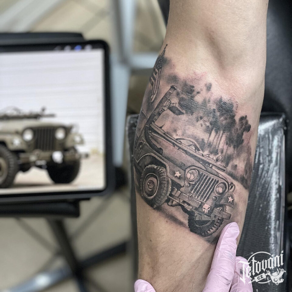 Tetování vojenské auto na předloktí