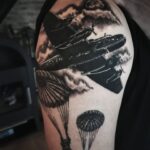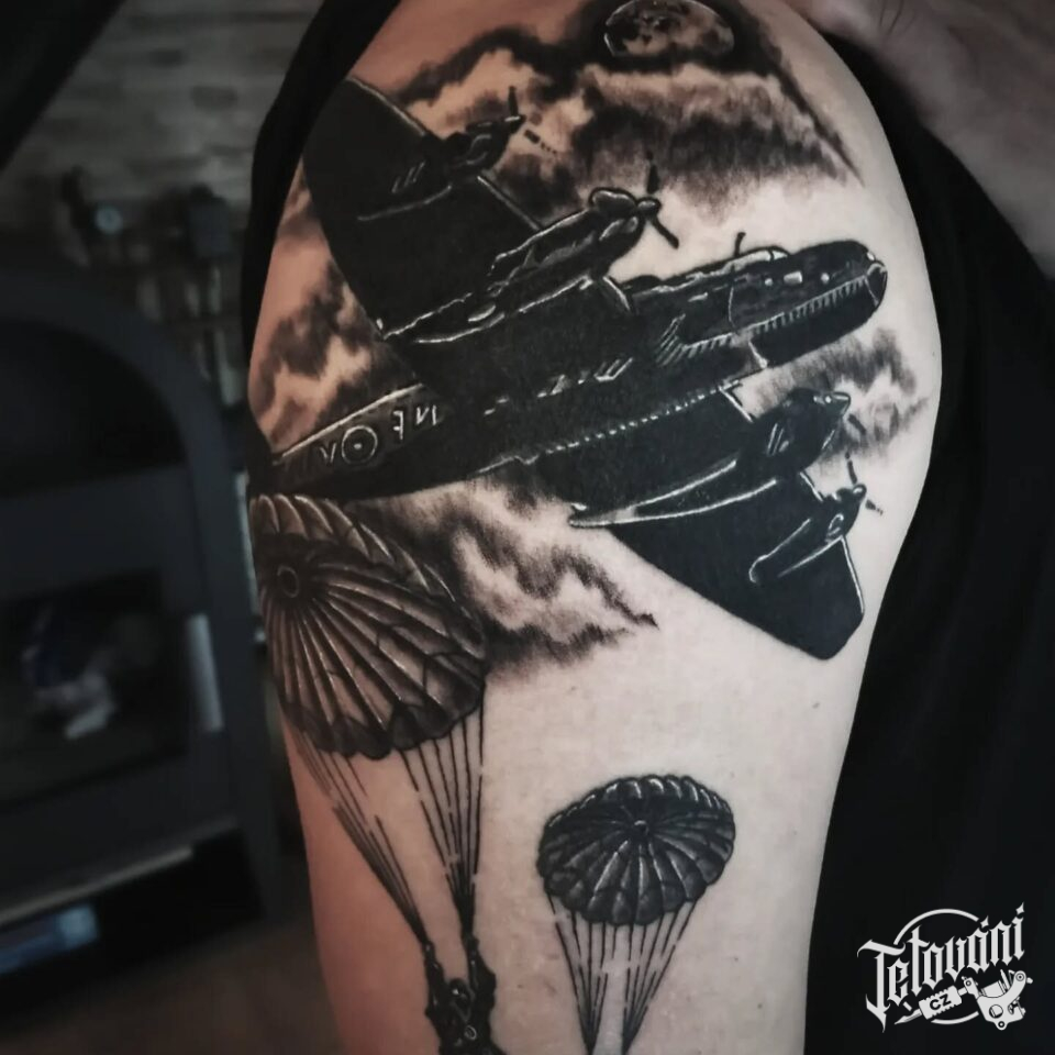 Tetování vojenské letadlo, vojáci, zbraně na rameno