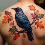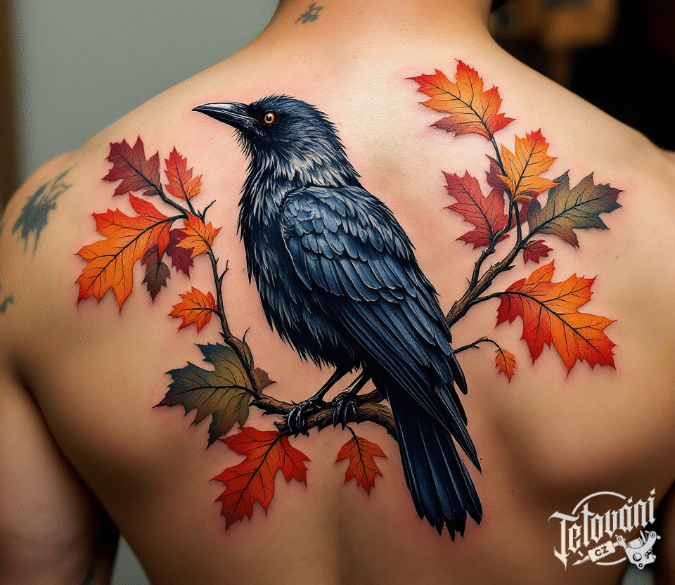Tetování vrána na větvičce na zádech