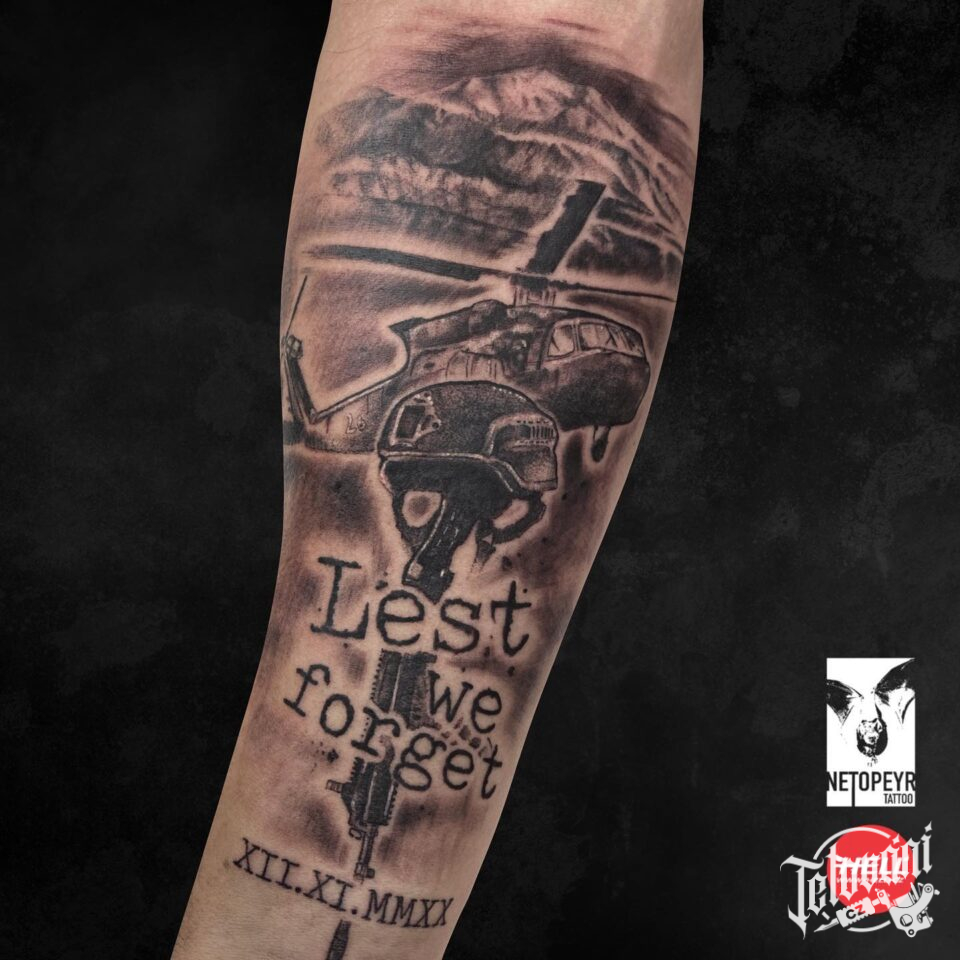 Tetování vrtulník, hory, nápisy, písmena, čísla na předloktí