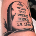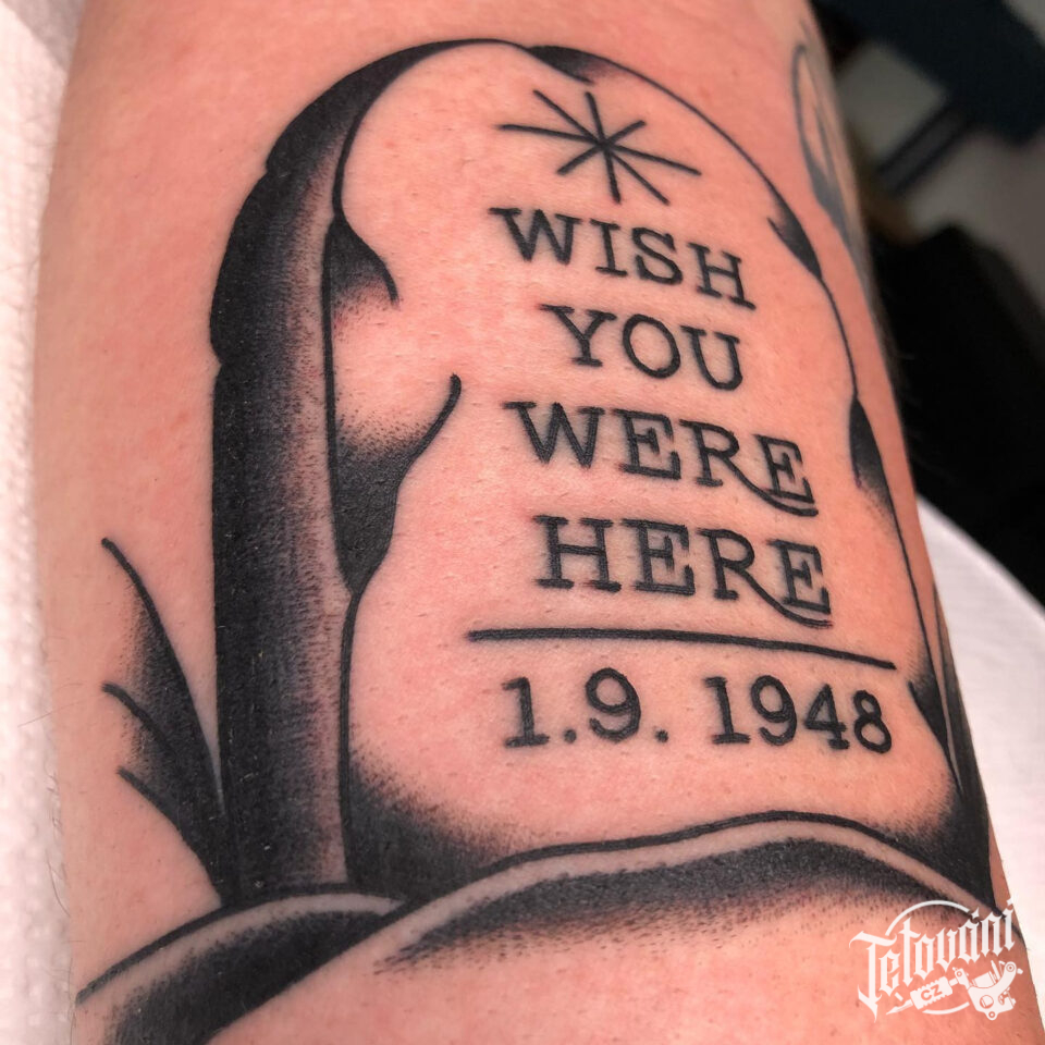 Tetování vzpomínkové tetování, pomník, nápis a čísla na předloktí