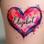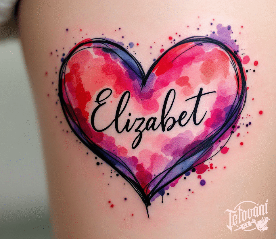 Tetování watercolor srdce a srdce se jménem na stehno