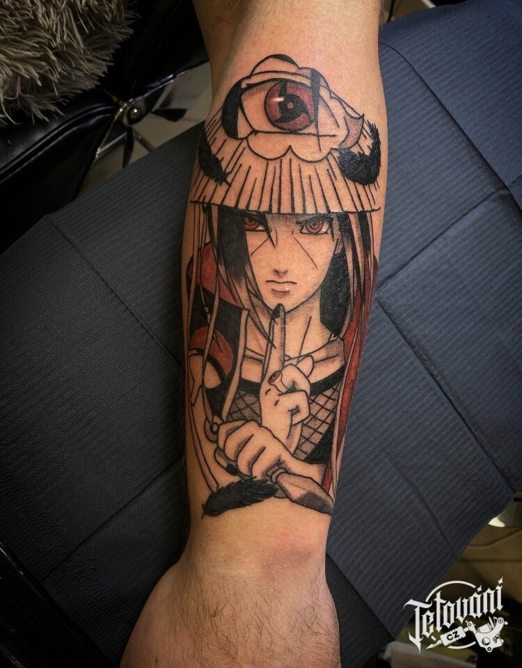 Tetování z anime filmů a pohádek Naruto, postava Itachi Uchiha na předloktí
