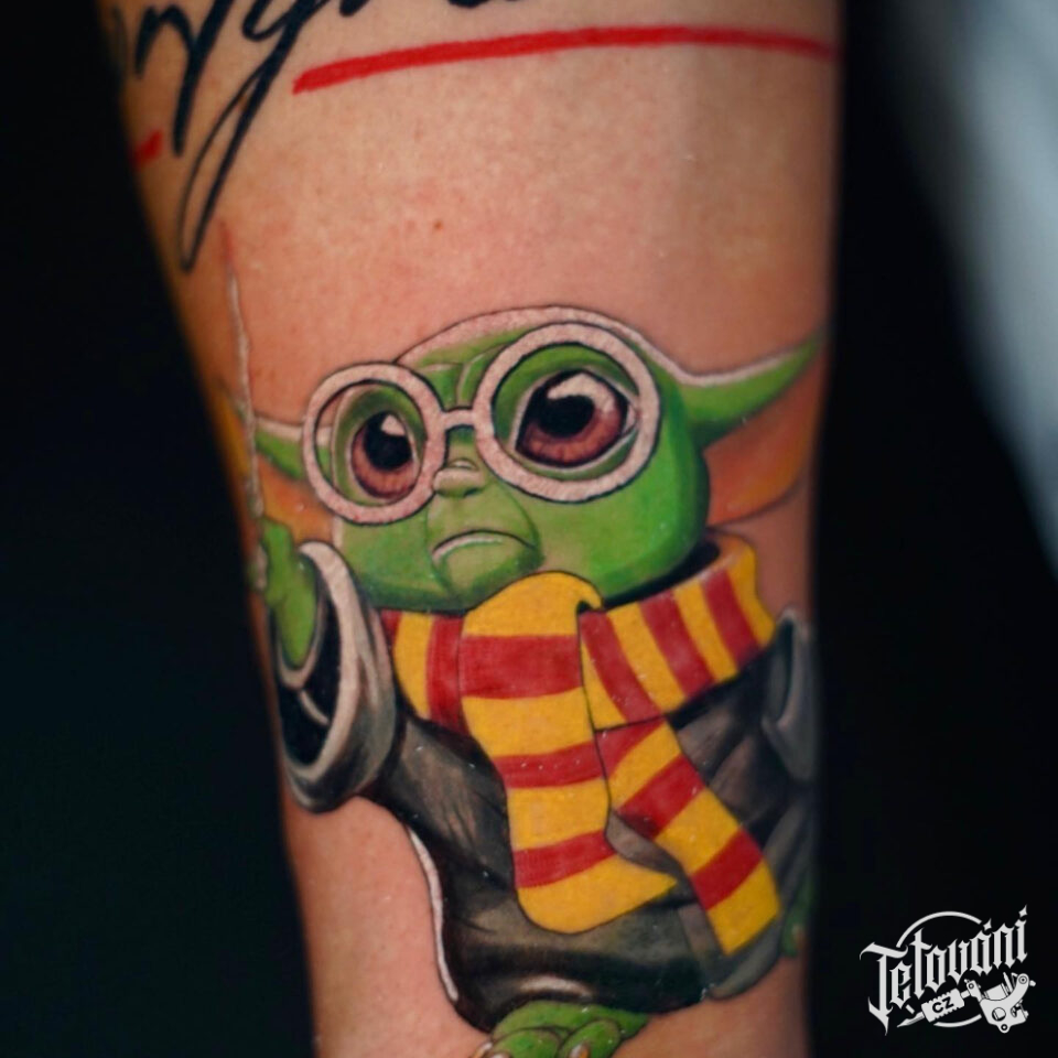 Tetování z filmů a pohádek Star Wars postavička Yody, jako Harry Potter na předloktí