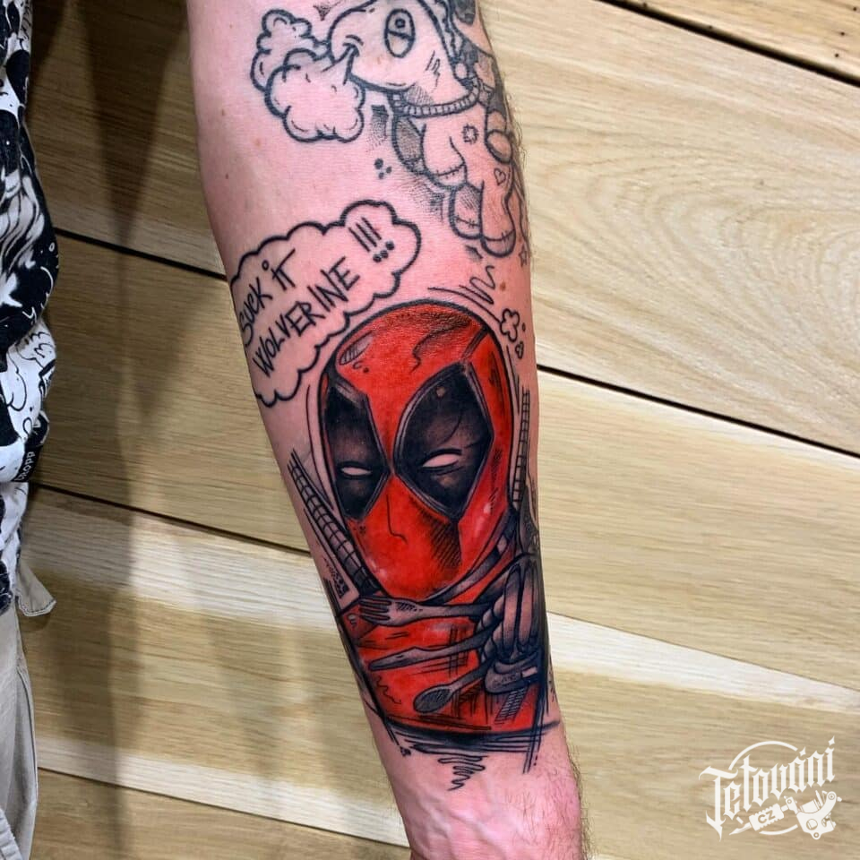 Tetování z filmů a pohádek a nápis na předloktí