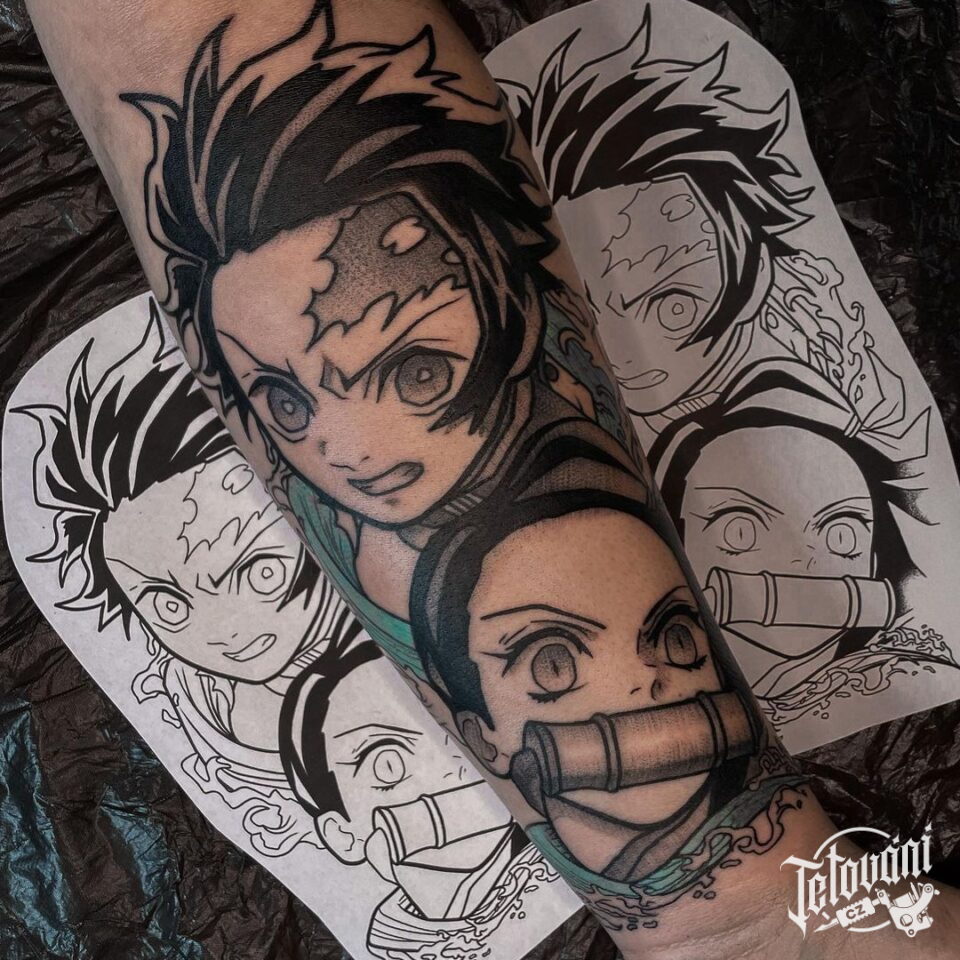 Tetování z filmů a pohádek, anime, Tanjiro a Nezuko na předloktí