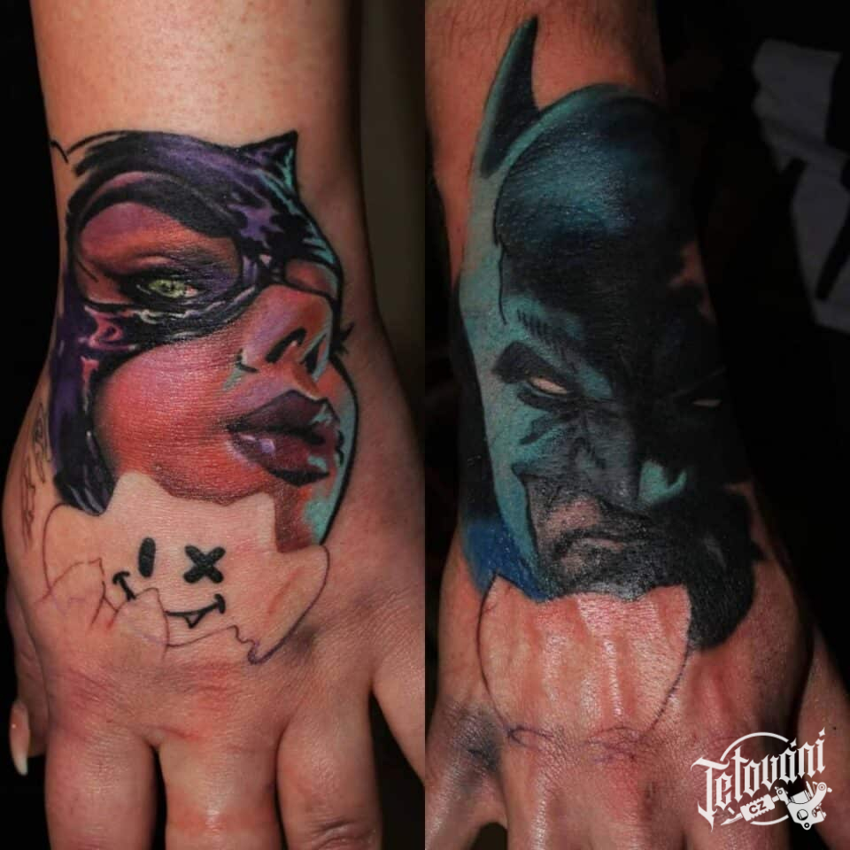 Tetování z filmů a pohádek Batman a Catwoman na hřbet ruky