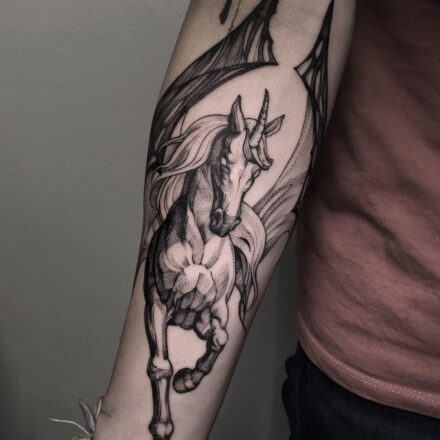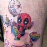 Tetování z filmů a pohádek Dead Pool a mýtické zvíře jednorožec na stehno