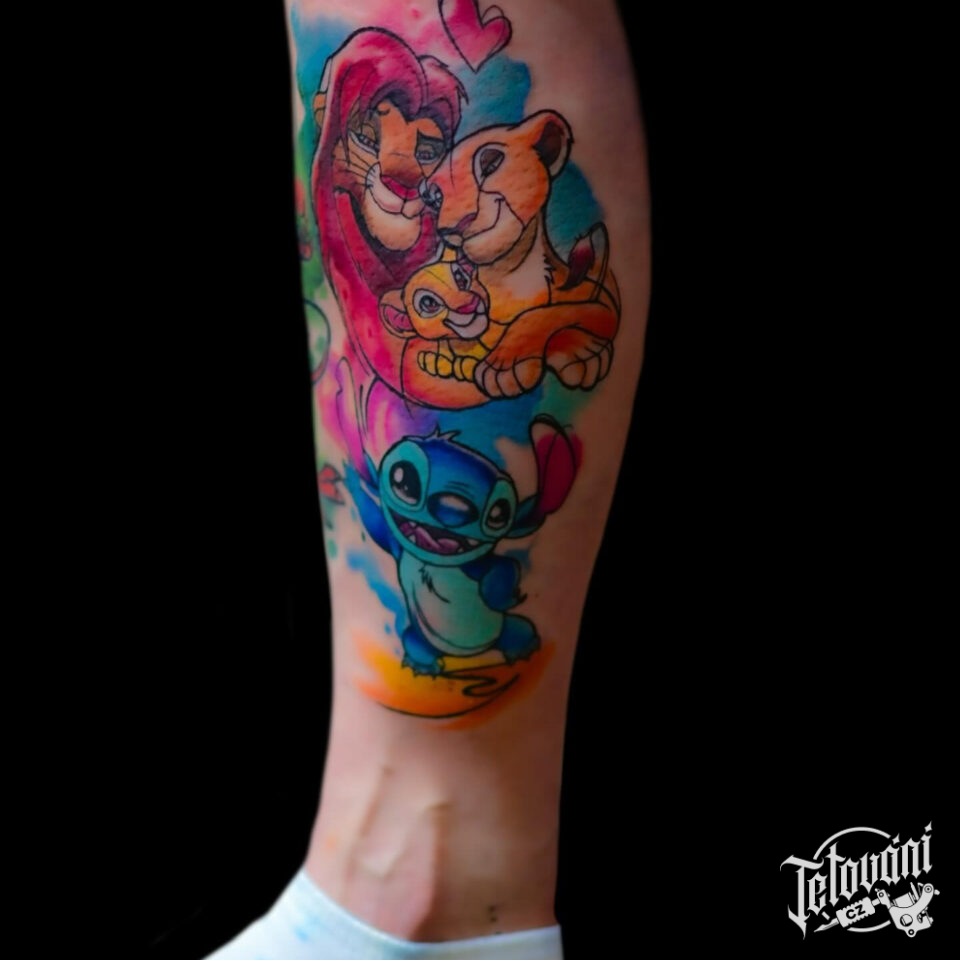Tetování z filmů a pohádek Disney postavičky – Lví Král, Stitch na lýtko
