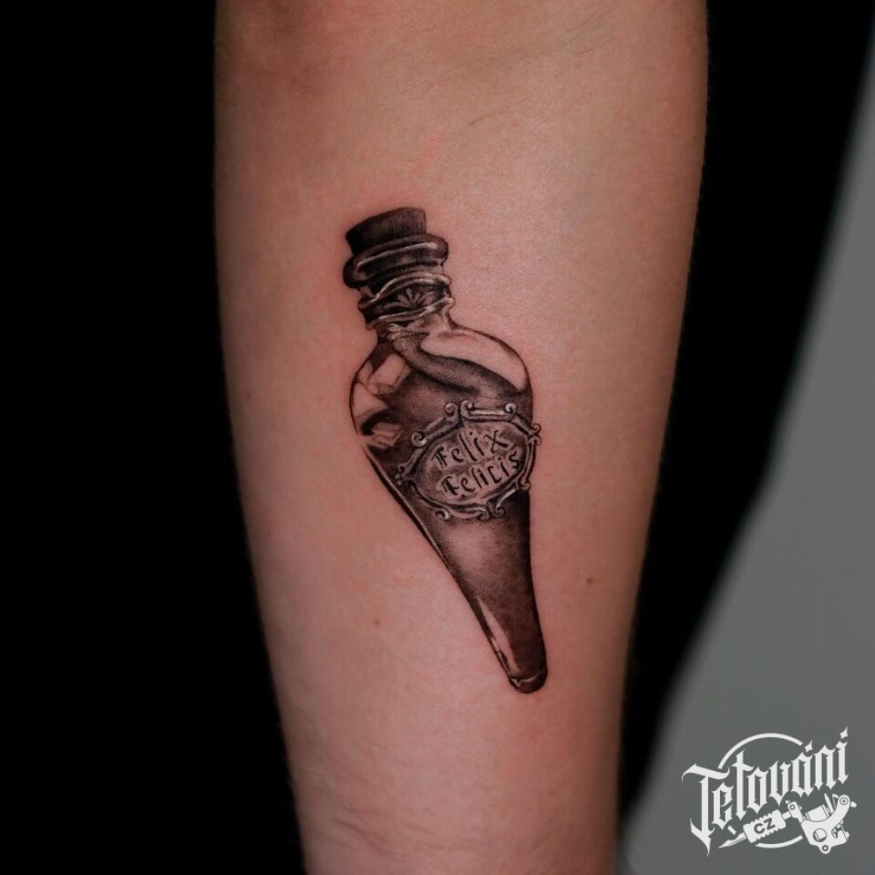 Tetování z filmů a pohádek elixír štěstí z Harryho Pottera na předloktí
