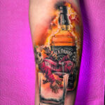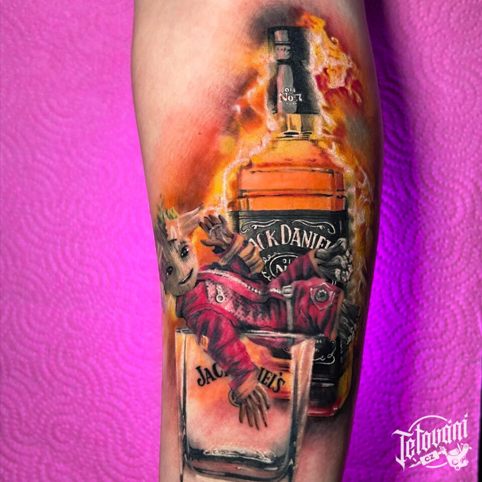 Tetování z filmů a pohádek Groot, předmět láhev Jack Daniels na předloktí