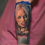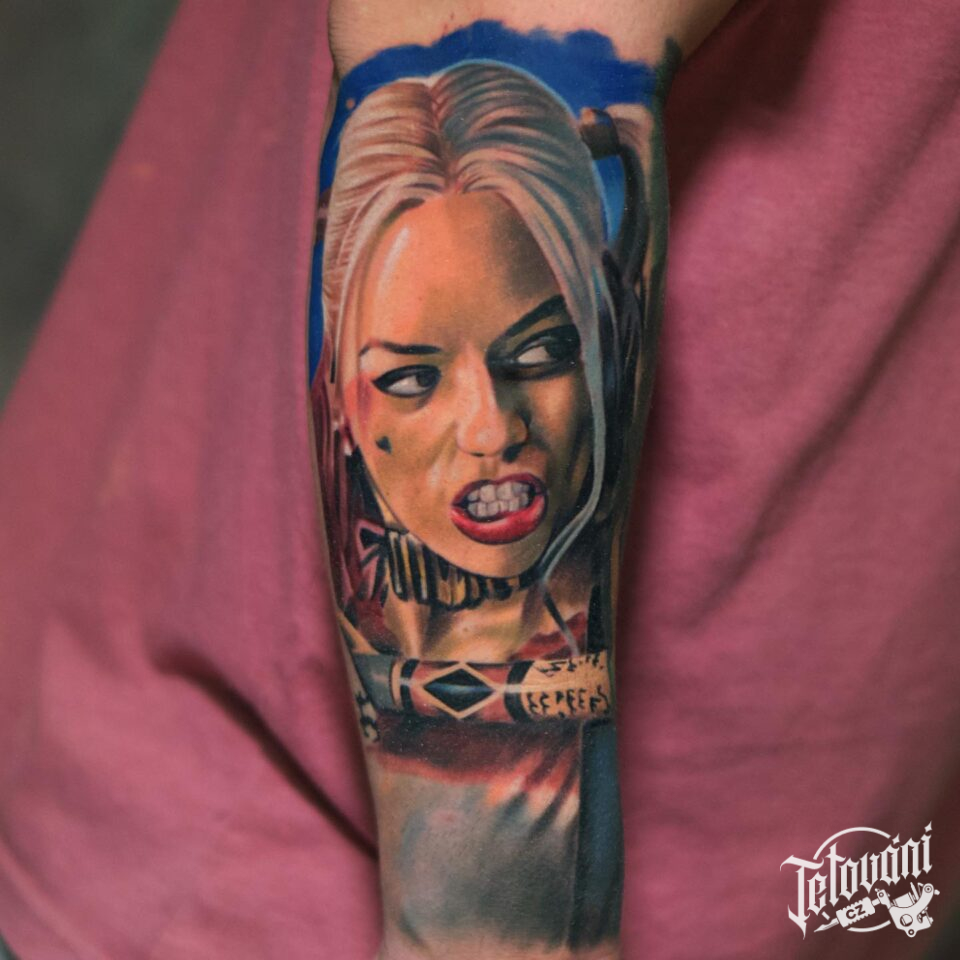 Tetování z filmů a pohádek Harley Quinn, portrét na předloktí