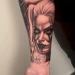 Tetování z filmů a pohádek Harley Quinn, portrét na předloktí