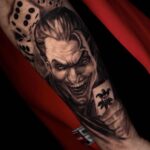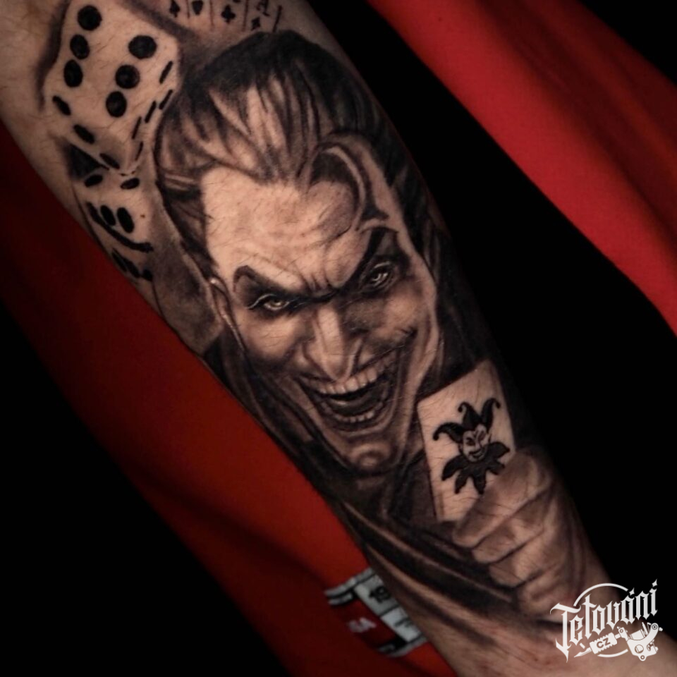 Tetování z filmů a pohádek, hrací kostky, karty, esa, Joker na předloktí