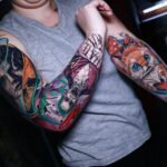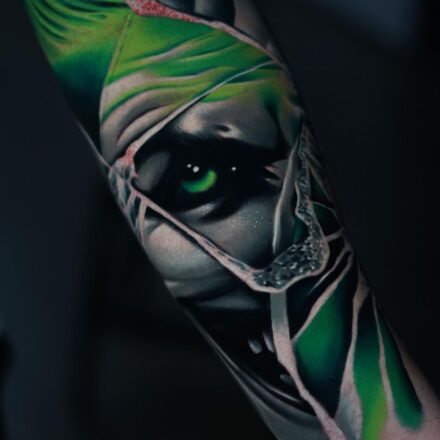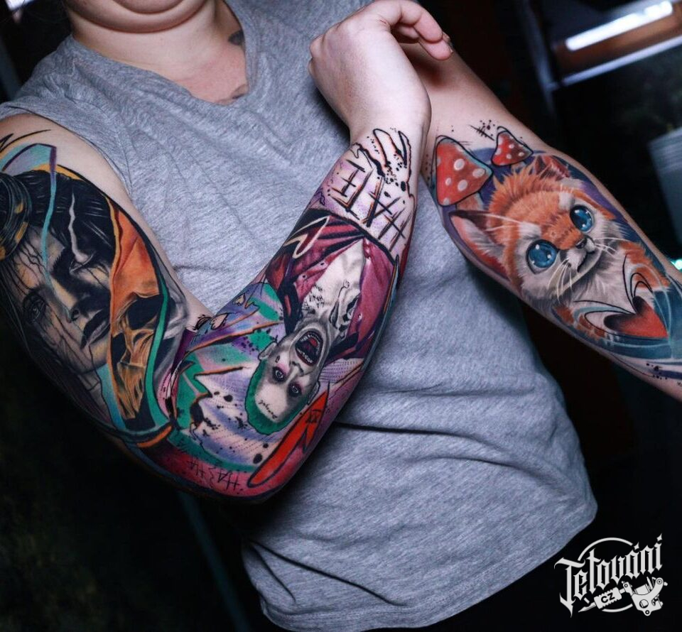 Tetování z filmů a pohádek Joker, portréty, zvíře kočka na ruku a rukáv