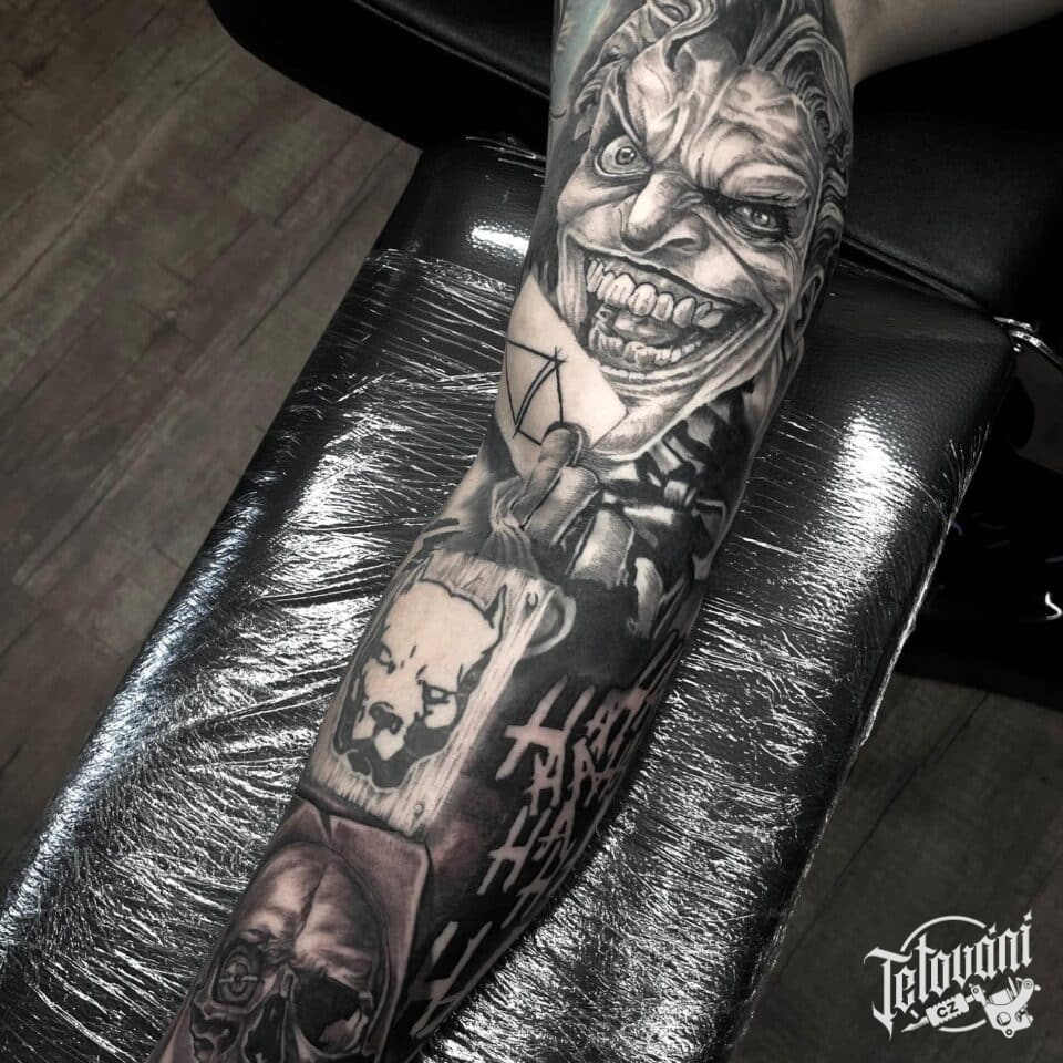 Tetování z filmů a pohádek Joker, zvíře pes, lebka na ruku