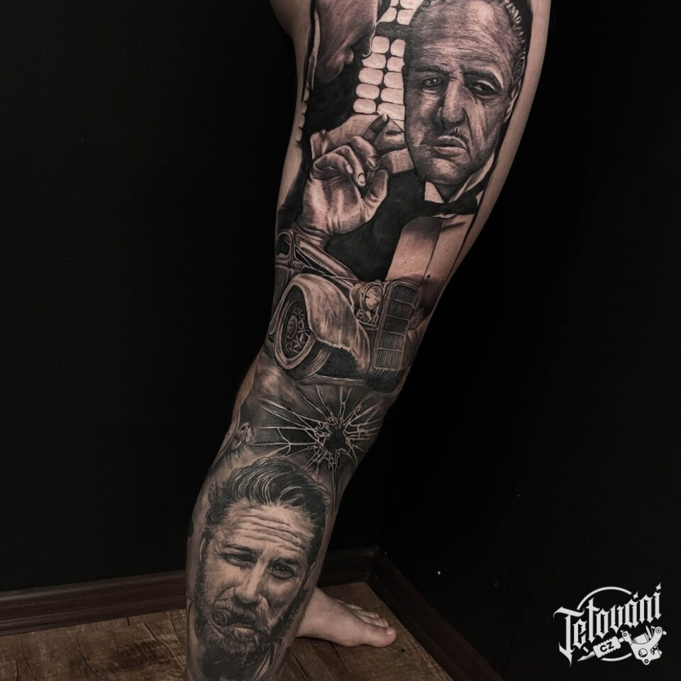 Tetování z filmů a pohádek Kmotr a Peaky Blinders, portréty na nohu