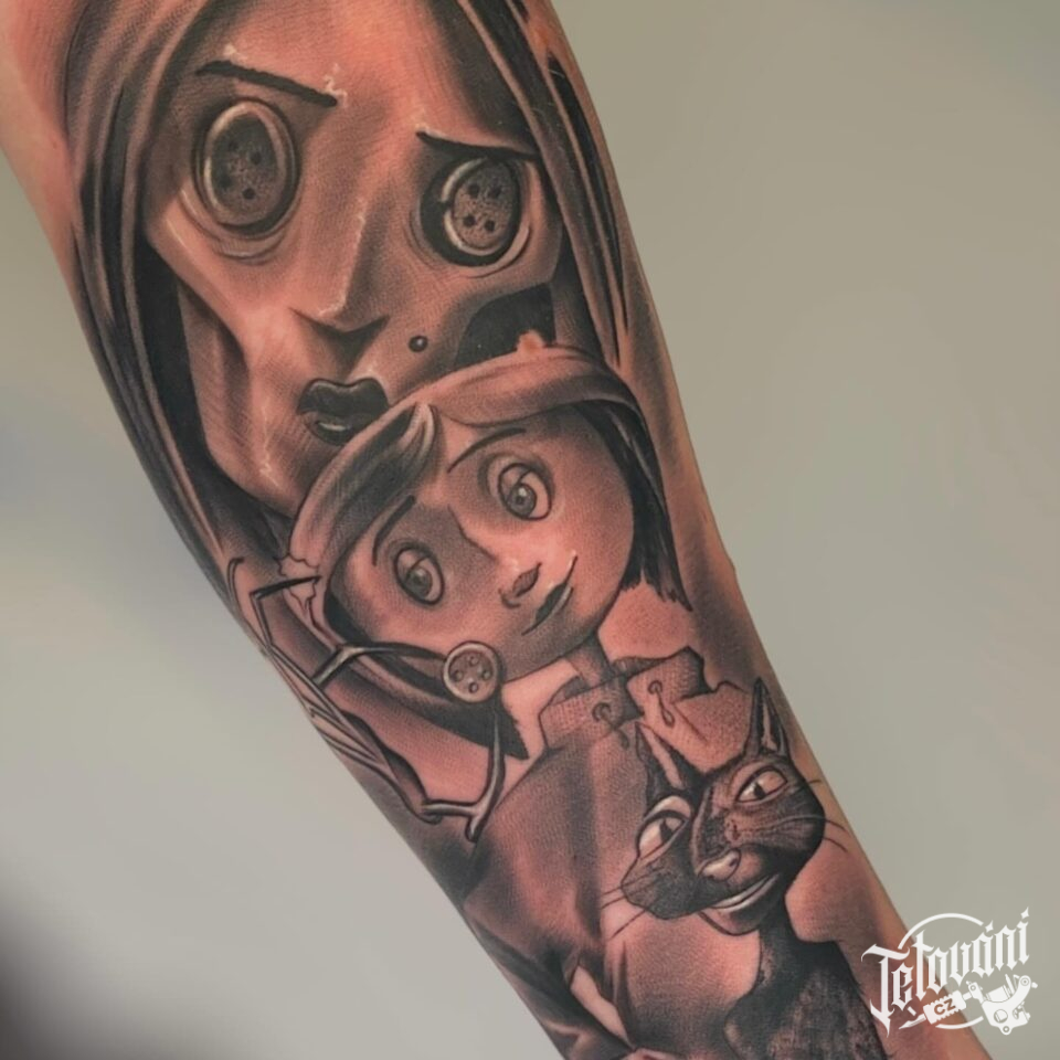 Tetování z filmů a pohádek Koralína, postavičky na předloktí