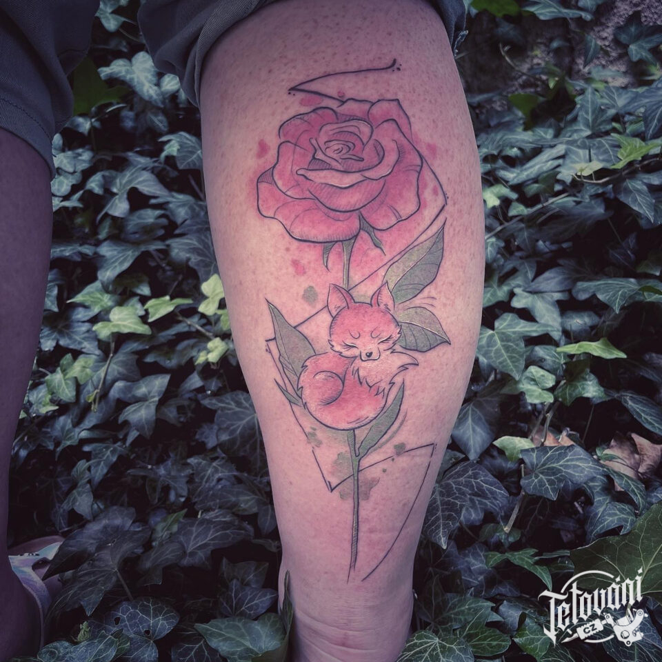 Tetování z filmů a pohádek Malý princ, květina, růže a zvíře, liška na lýtku
