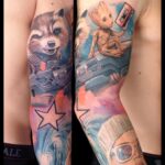 Tetování z filmů a pohádek Marvel, Strážci Galaxie, postavičky Groot a Rocky, hvězda, vesmír na ruku