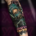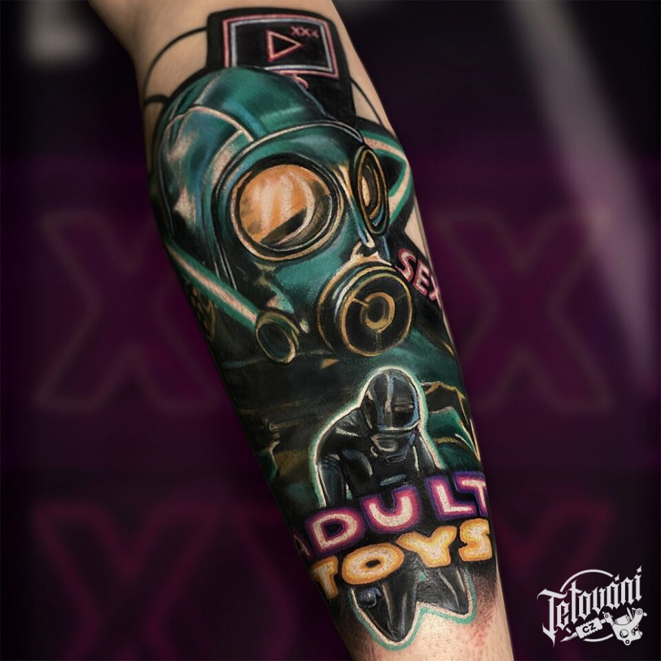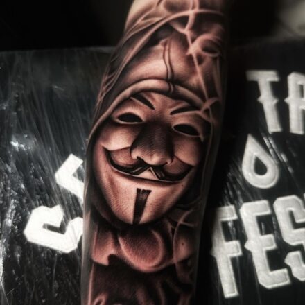 Tetování z filmů a pohádek, maska a nápis na předloktí