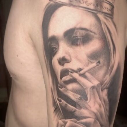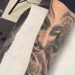Tetování z filmů a pohádek, maska, květina, růže, portrét na předloktí
