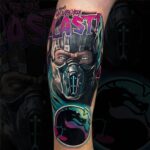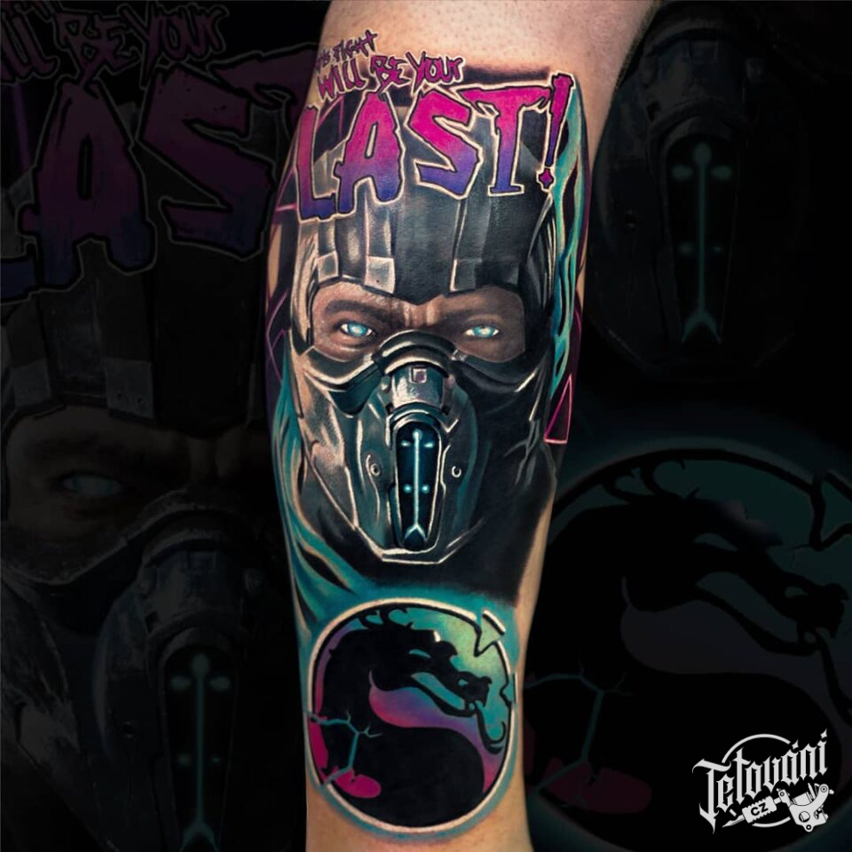 Tetování z filmů a pohádek, maska, mýtické bytosti, drak a nápisy na předloktí