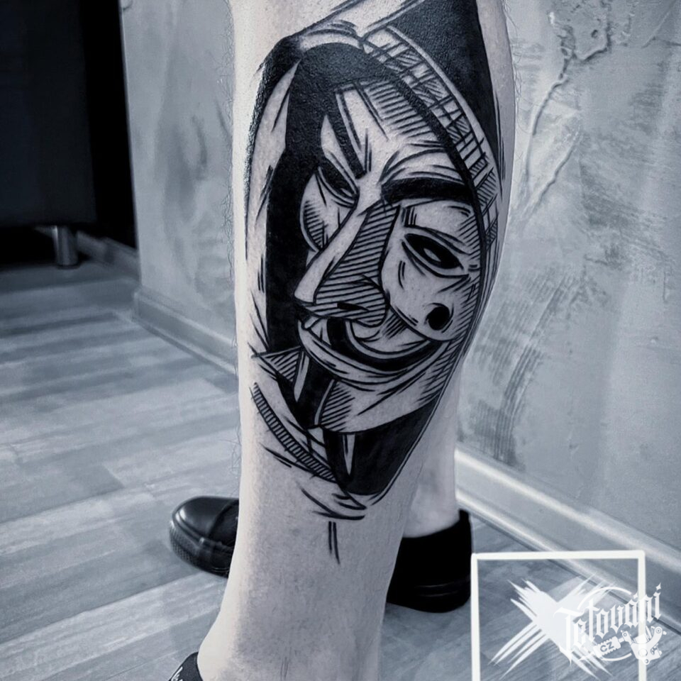 Tetování z filmů a pohádek, maska, portrét na lýtku