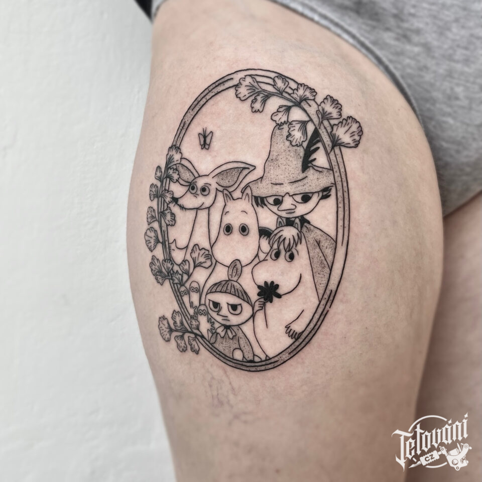 Tetování z filmů a pohádek na boku stehna