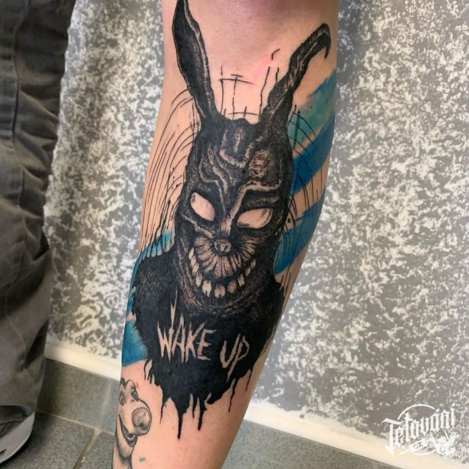 Tetování z filmů a pohádek, nápis, maska a znamení zla na noze