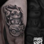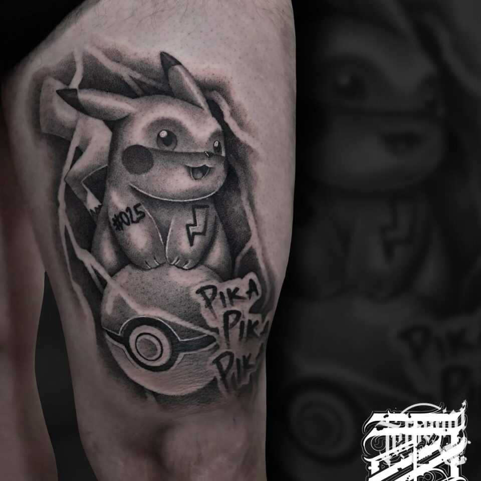 Tetování z filmů a pohádek Pikachu na stehně